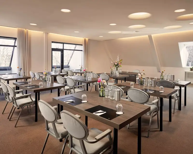 Room 7 is located on the second floor of Hotel Arnhem. It is a business-style room with natural light, suitable for meetings of 2 to 70 people in various configurations. The room is equipped with climate control, a projector, projection screen, flipchart with markers, and WiFi via fiber optic network.