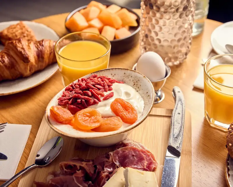 Every morning you are welcome in restaurant De Veluwe for a generous breakfast buffet. From fresh, crispy rolls and various types of fillings (such as cheese, cold cuts, and salmon) to hot dishes, fresh fruit, yogurt, sweets, and a wide selection of coffee, tea, and juices.