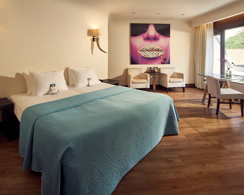 The triple Comfort Room (45 m2) is specially equipped for a comfortable stay for three persons with a double bed (twin) and a single bed. The spacious, open bathroom has a bathtub and a separate shower cabin. The toilet is in a separate enclosed room, separate from the bathroom. There are also coffee and tea making facilities, telephone, flat-screen TV and a safe. From the balcony or terrace you can enjoy the peaceful surroundings.