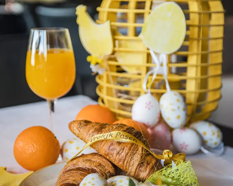 Wij ontvangen u graag met een glaasje Cuvée Prestige en een amuse om de middag feestelijk te beginnen. Vervolgens serveren wij een soep van de dag, die door onze bediening aan tafel wordt uitgeserveerd. Laat u hierna verrassen door een uitgebreid brunchbuffet vol seizoensgebonden en culinaire paasgerechten, zorgvuldig samengesteld om uw paasbeleving compleet te maken.